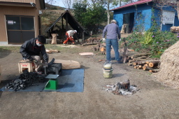 この冬最初に炭焼き体験をされた横浜の加藤さんご夫妻。今回は三回目。特に奥様は熱心に取り組んでいます。前回は煙に悩まされた反省で今回は重装備。炭木づくりから止め窯まで三日連続の体験をされました。そして一週間後の窯出し、良い炭が焼けました。加藤さんは来るたびにクロとトラに美味しいネコめしを持参してくれます。普段食べないご馳走にネコたちは飛びついていました。 |