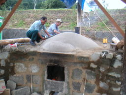 | テンジョーイ1(H15.7.19) いよいよ炭窯づくりでも特に難しいテンジョーイとなった。テンジョーイとは君津市史民俗編によれば天井覆いのこととある。またこの日は作業の性質からたくさんの人手を要する。粘土と砂を配合し練る人、粘土を一定の大きさにぼた餅のように丸める人、このぼた餅粘土を窯の天井に並べていく人などである。昔からテンジョーイにはぼた餅を造りお祝いをしたそうだ。そこで今日のテンジョーイには三経寺の蓮波住職をはじめ写経会の皆さんや御近所の皆さんなどをお願いしてワイワイと楽しく作業をすることとした。 |